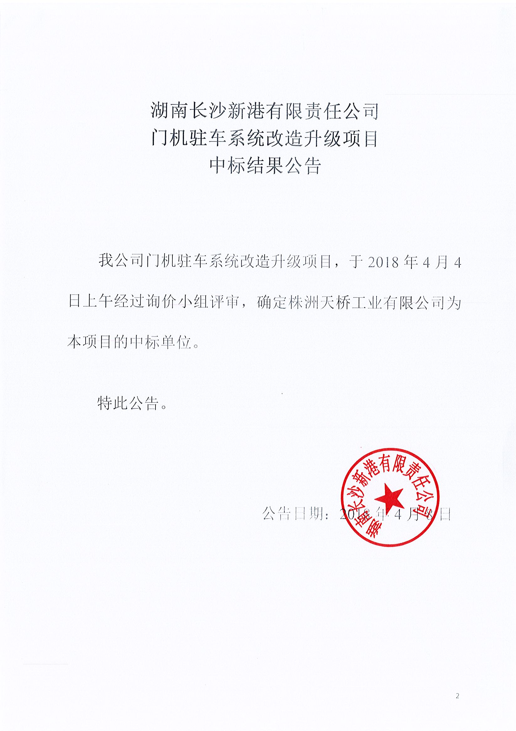 湖南長沙新港有限責任公司 門機駐車系統改造升級項目中標結果公告