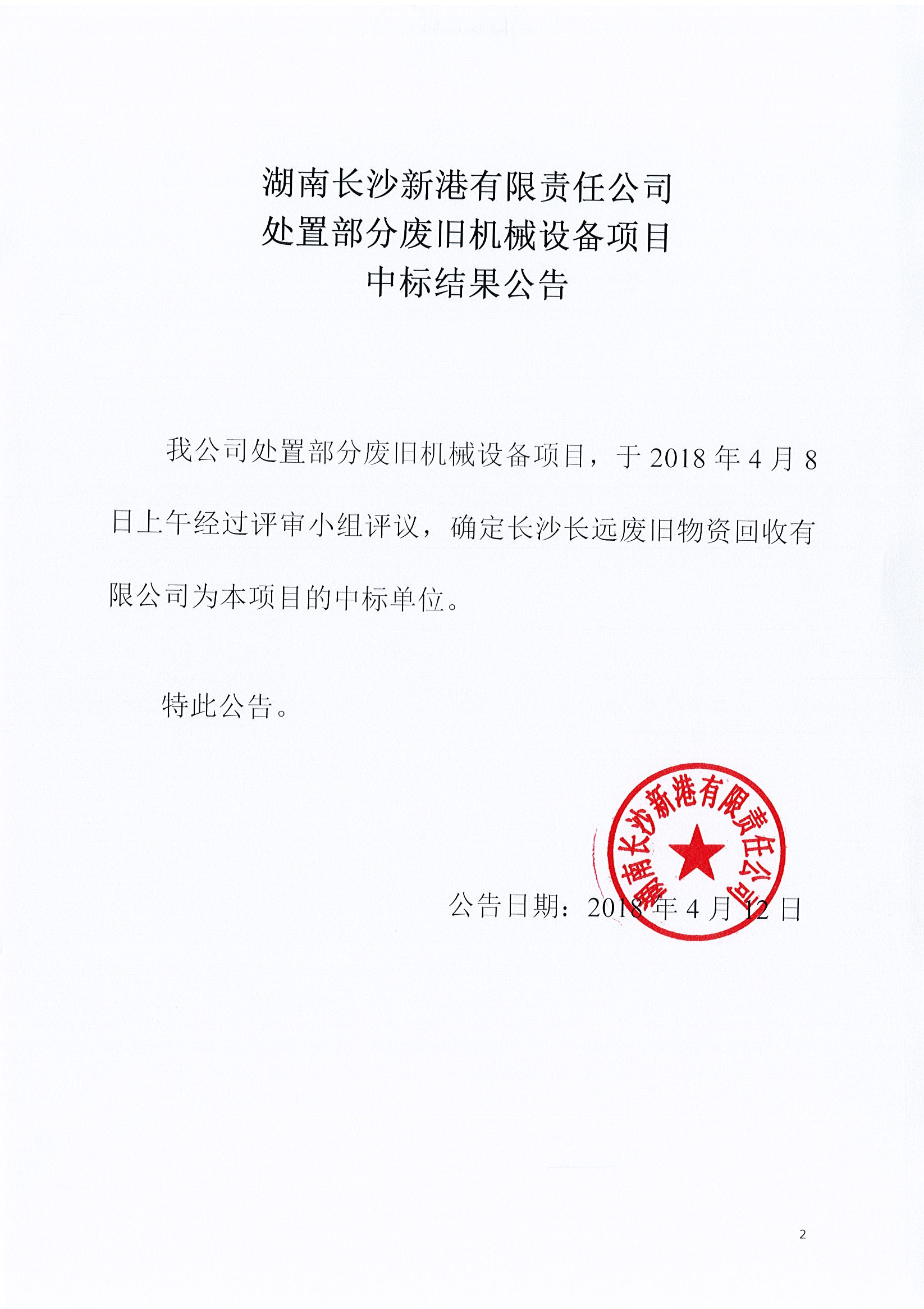 湖南長沙新港有限責任公司 處置部分廢舊機械設備項目中標結果公告