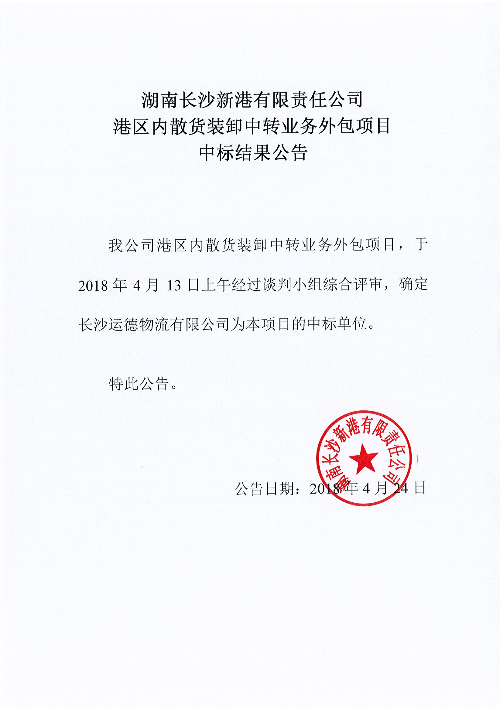 湖南長沙新港有限責任公司 港區內散貨裝卸中轉業務外包中標結果公告