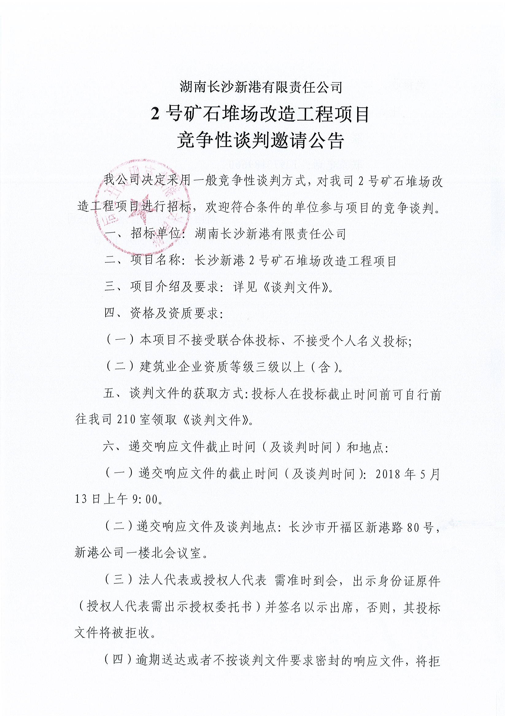 湖南長沙新港有限責任公司 2號礦石堆場改造工程項目競爭性談判邀請公告