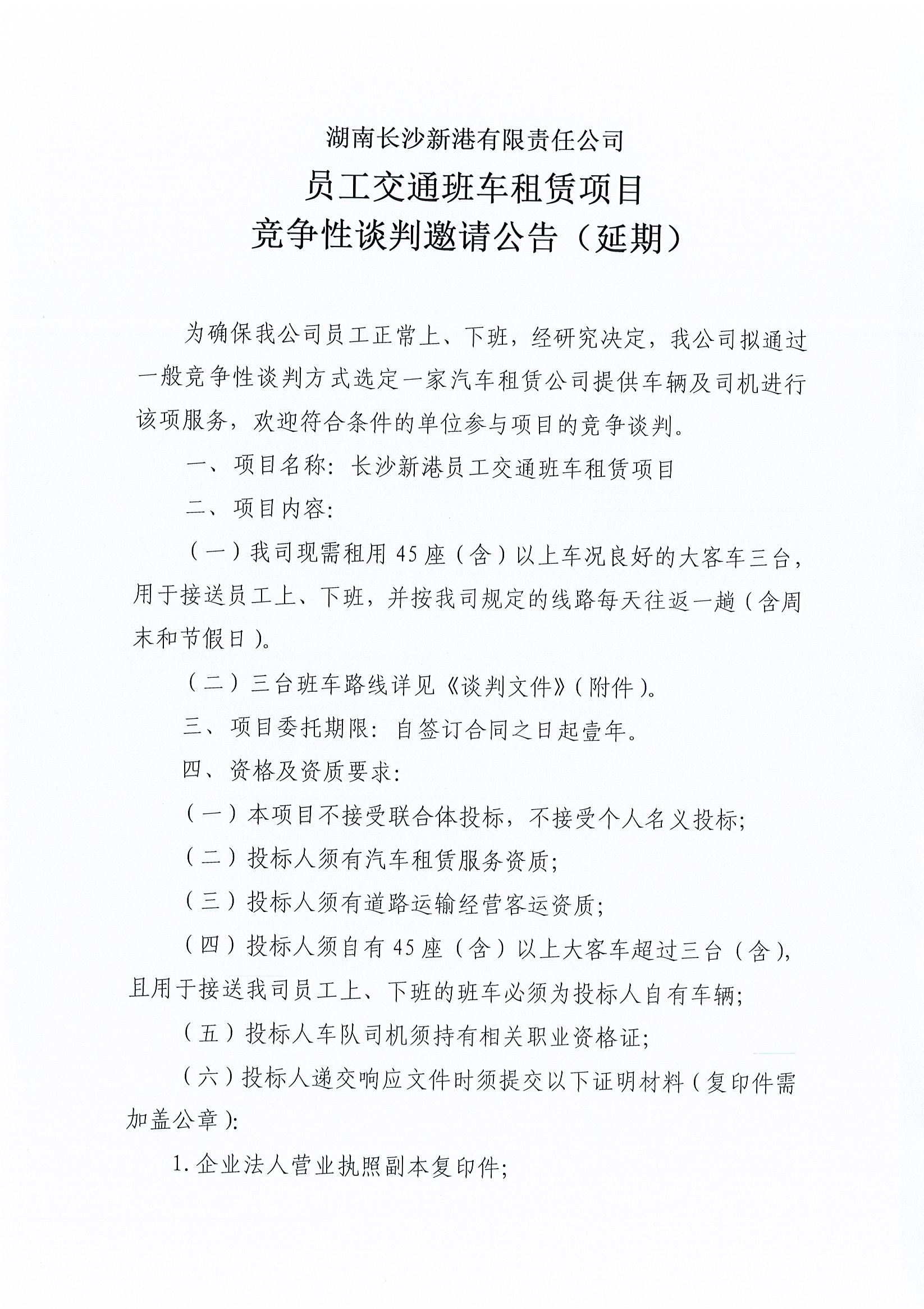 湖南長沙新港有限責任公司 員工交通班車租賃項目競爭性談判邀請公告(延期)