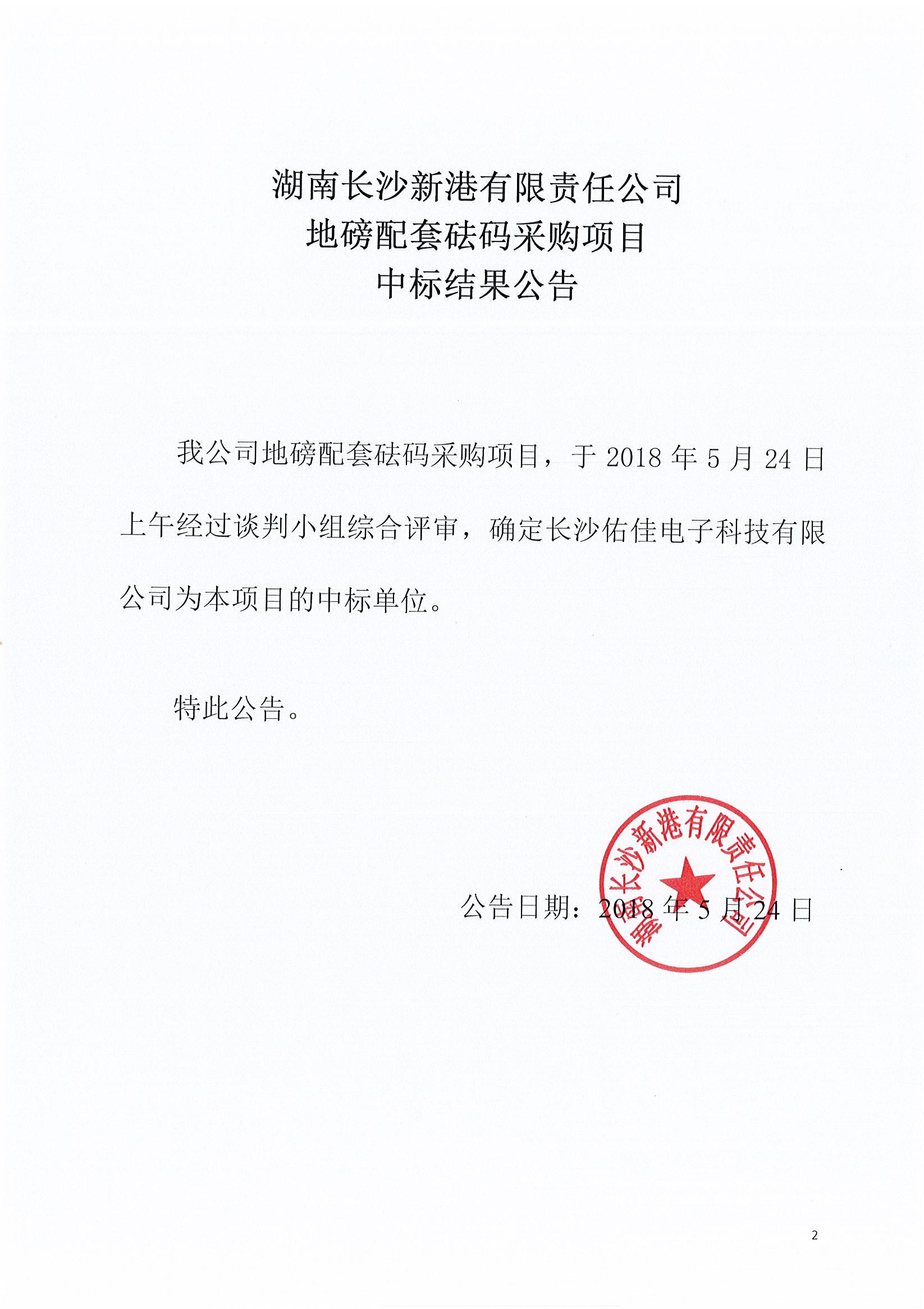 湖南長沙新港有限責(zé)任公司 地磅套砝碼采購項目中標結(jié)果公告