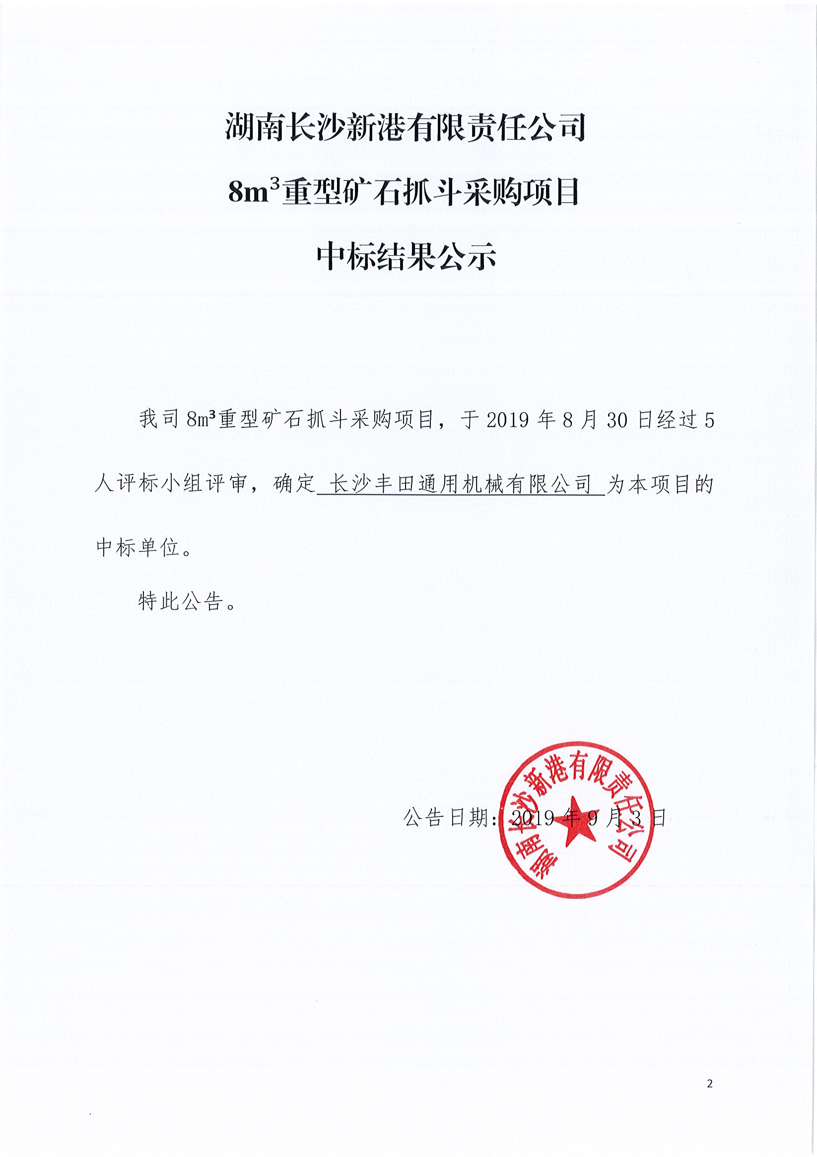 湖南長沙新港有限責任公司8m³重型礦石抓斗采購項目中標結果公示