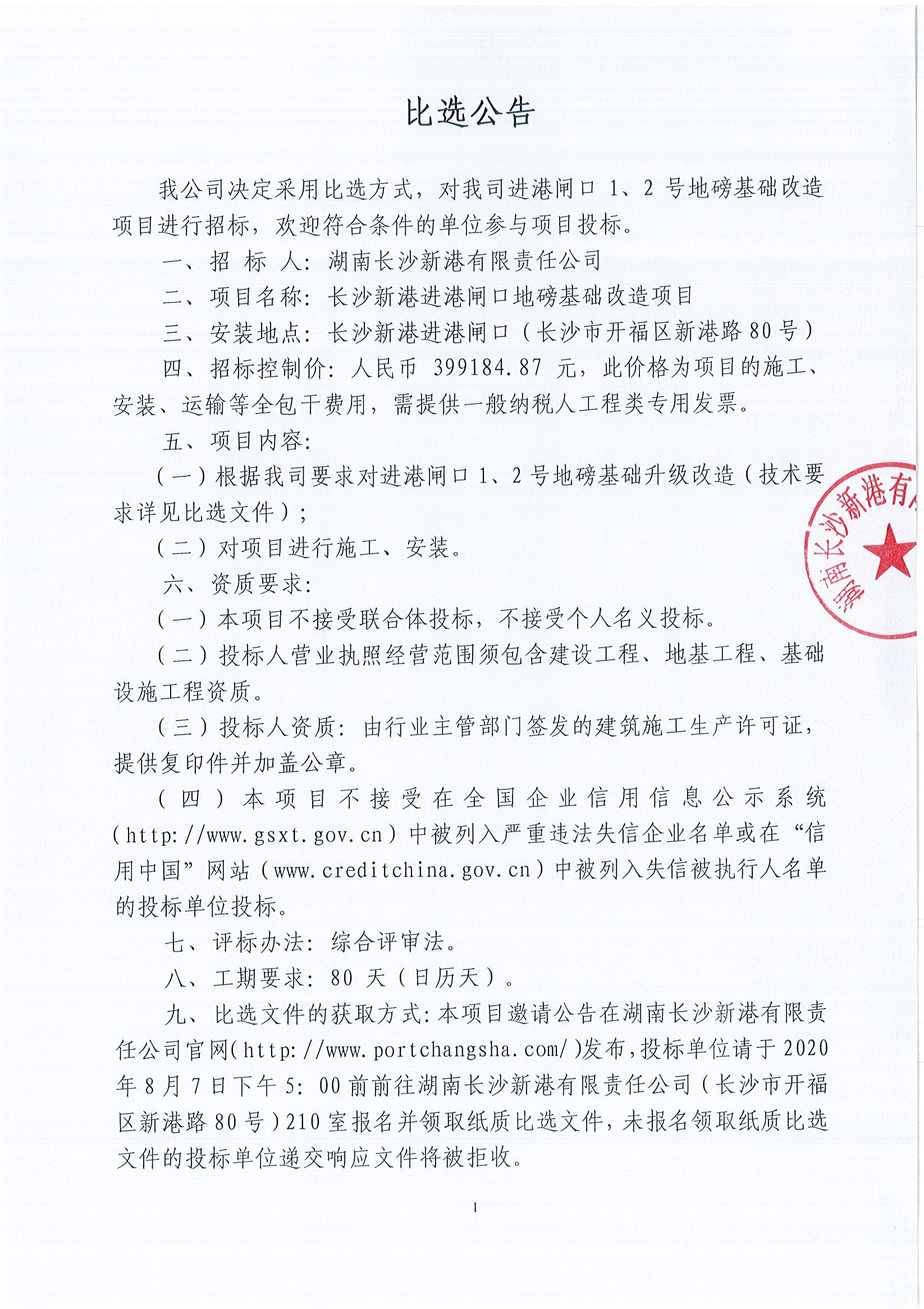 長(zhǎng)沙新港進(jìn)港閘口地磅基礎(chǔ)改造項(xiàng)目比選公告
