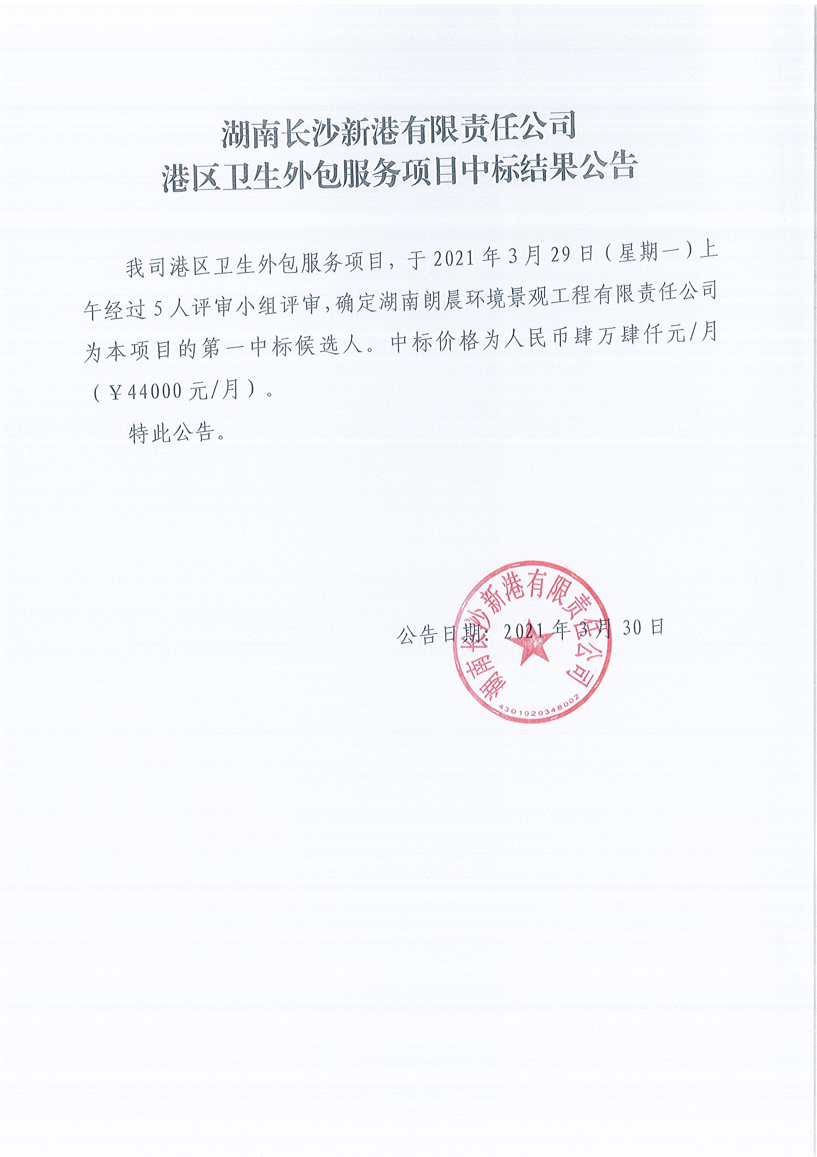 湖南長沙新港有限責任公司港區衛生外包服務項目中標結果公告