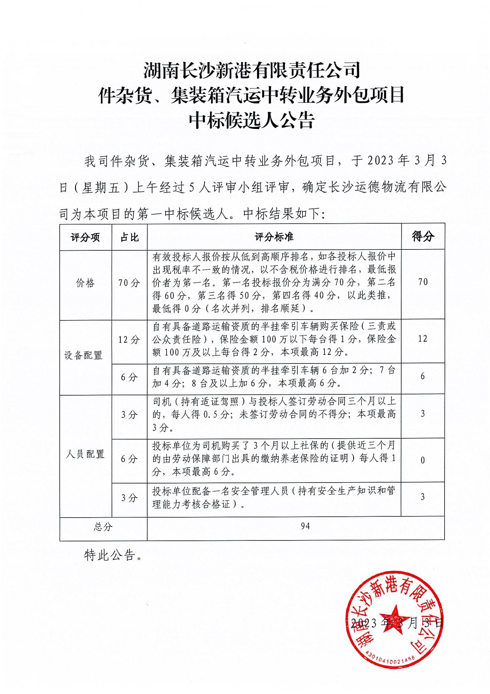 湖南長沙新港有限責任公司件雜貨、集裝箱汽運中轉業務外包項目中標候選人公告