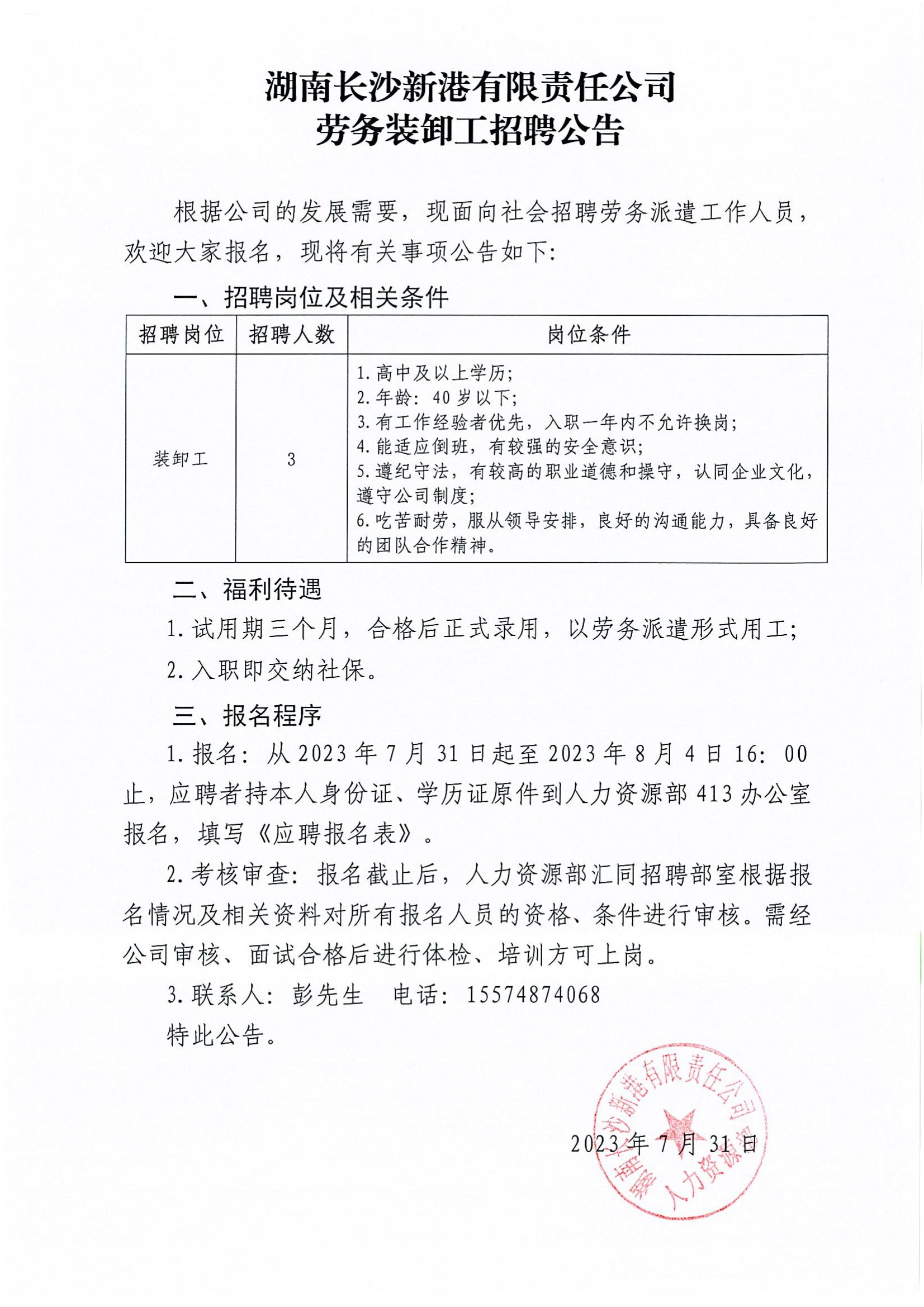 勞務裝卸工招聘公告