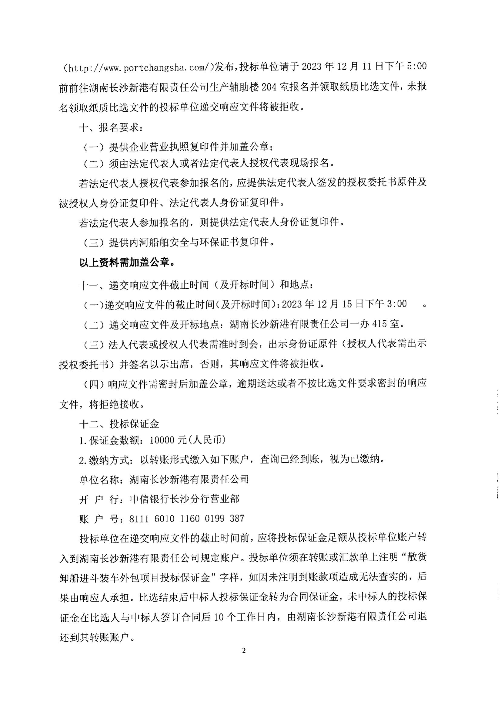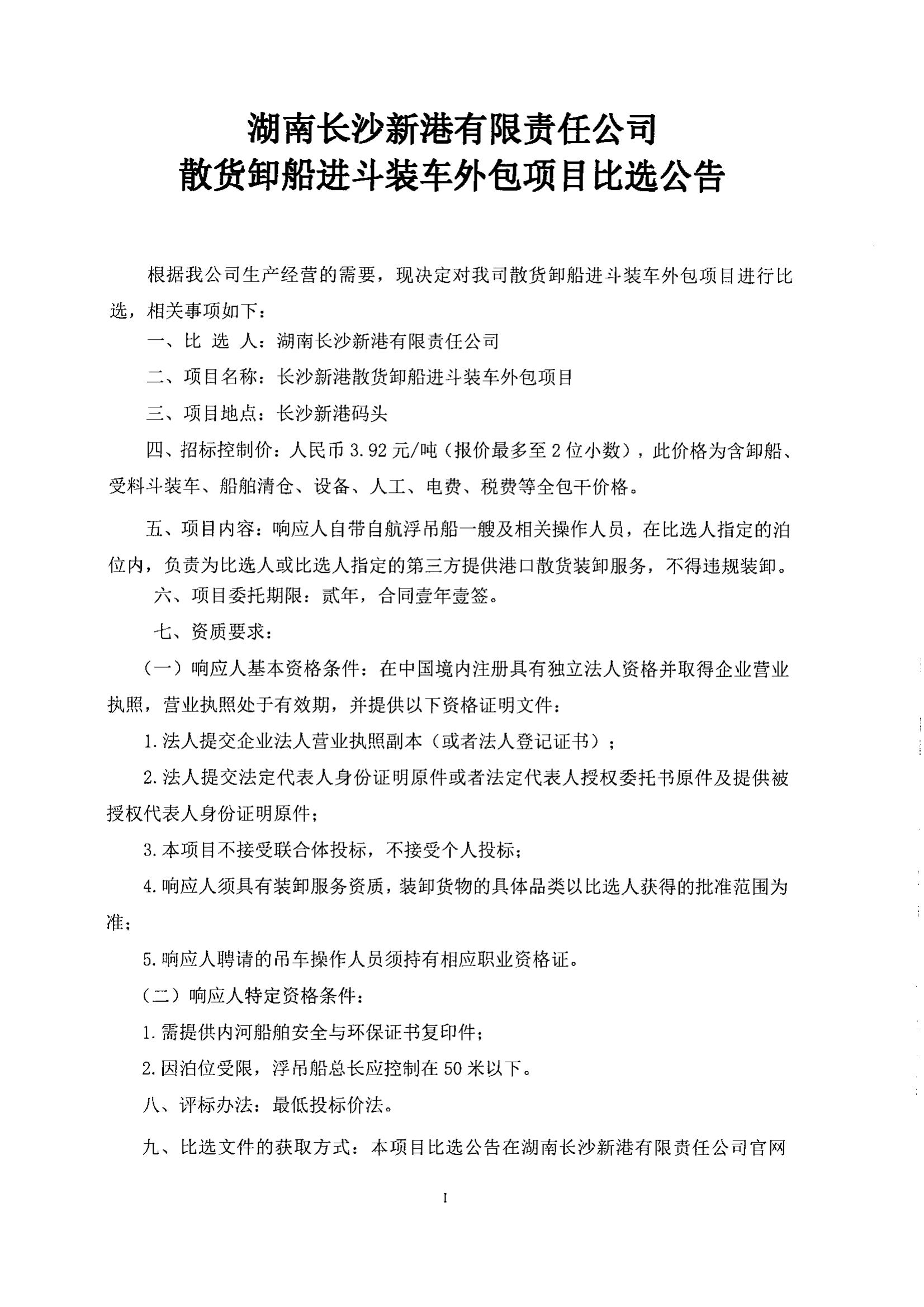 湖南長沙新港有限責(zé)任公司散貨卸船進斗裝車外包項目比選公告