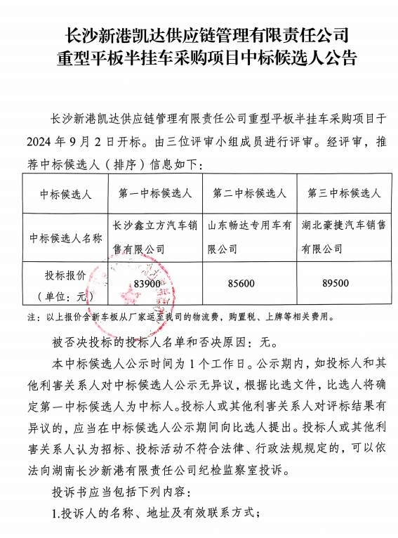 長沙新港凱達(dá)供應(yīng)鏈管理有限責(zé)任公司重型平板半掛車采購項(xiàng)目中標(biāo)候選人公告
